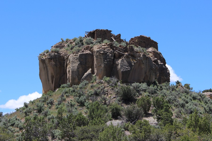 Situated on top of a large sandstone massif overlooking San Rafael Canyon to the north, this pueblito is one of the most defensible. It consists of two roomblocks separated by a small courtyard and two forked-pole hogans enclosed within a defensive wall. At least 10 ground floor rooms and two second-story rooms are present. The presence of three corn plant petroglyphs at the base of the massif gave the site its name (Powers and Johnson 1987).